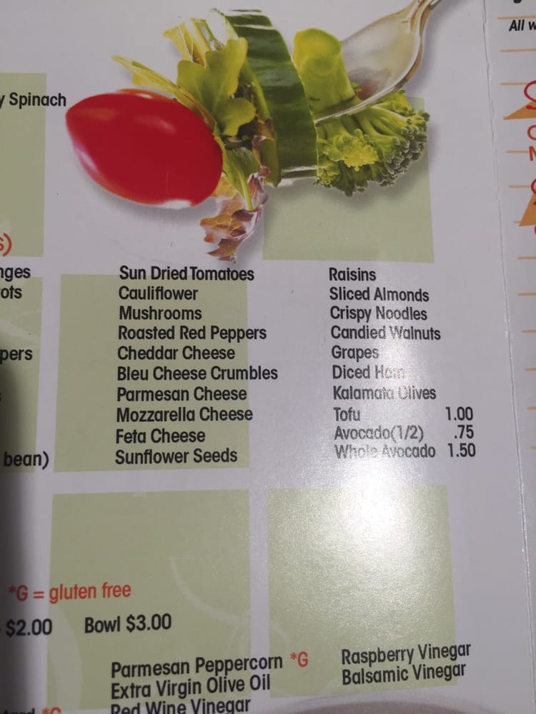 Choice of greens, up to 6 toppings and dressing. Additional toppings extra.